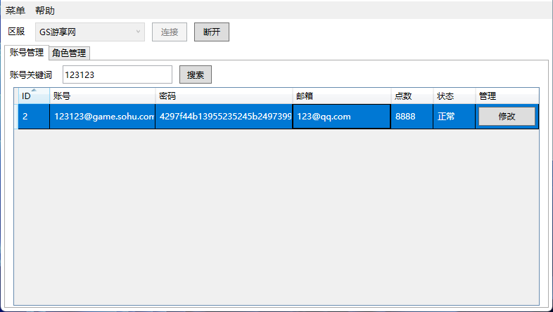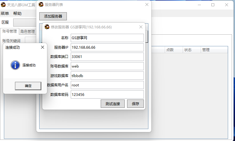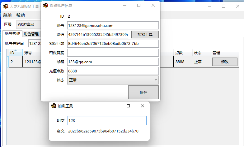 - 服务器与账号管理:可添加、修改服务器信息,进行连接测试,还能管理游戏账号,如修改账号信息(密码、密保、充值点数等),使用加密工具对密码等进行加密处理。