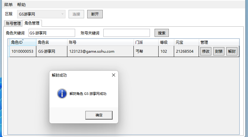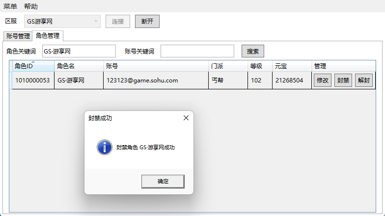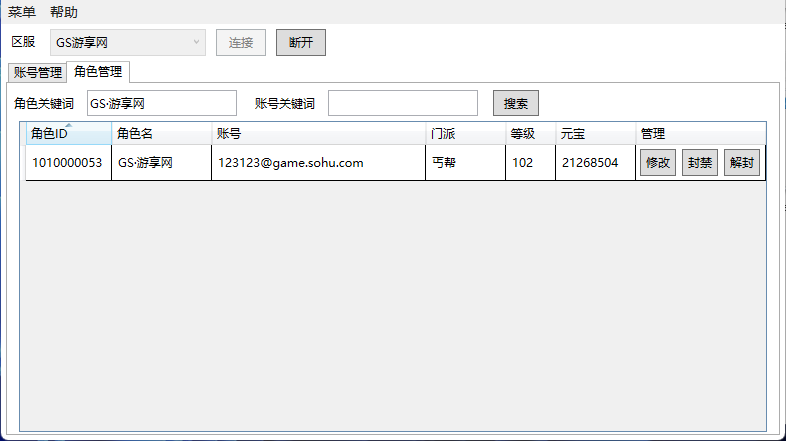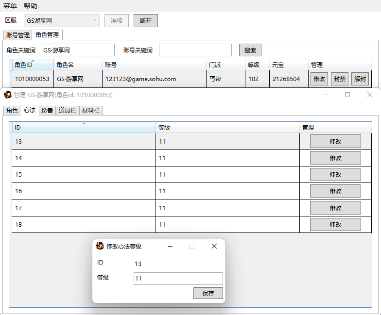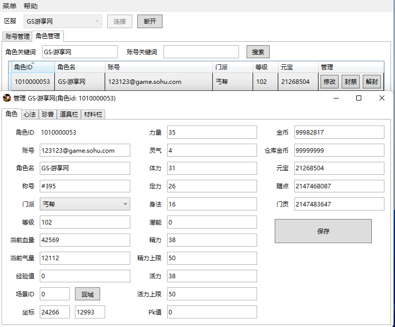 - 角色管理:能查看和修改角色的详细数据,包括角色 ID、名字、账号、门派、等级、元宝等基本信息,以及力量、灵力、体力等属性,还有经验值、坐标等,也可对角色进行封禁、解封操作。