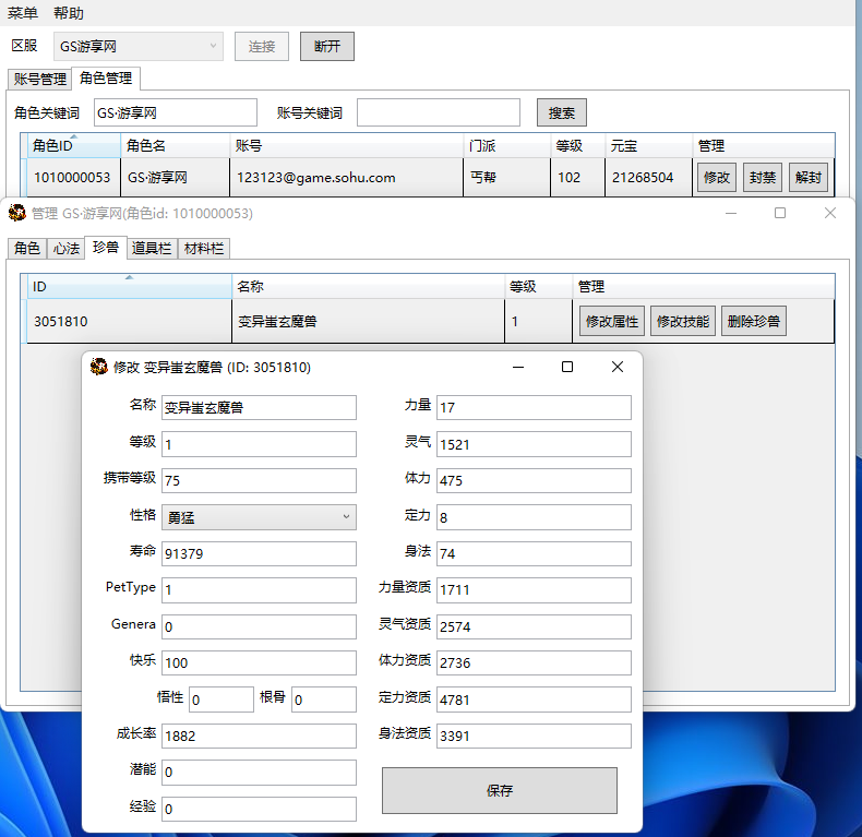 - 珍兽管理:可管理角色的珍兽,查看珍兽的 ID、名称、等级等,能修改珍兽的属性(力量、灵力、体力等资质,性格、寿命等)和技能,也可删除珍兽。