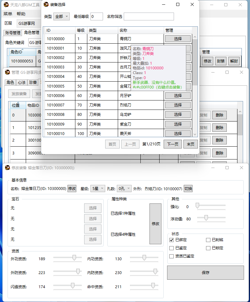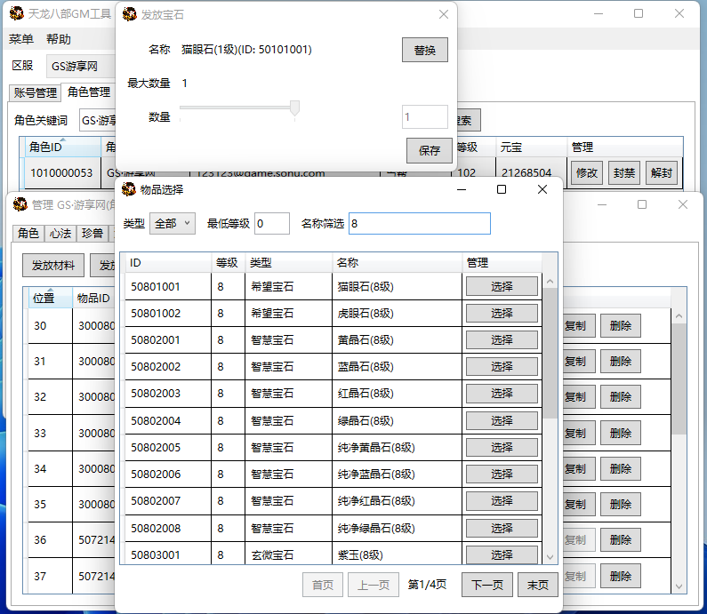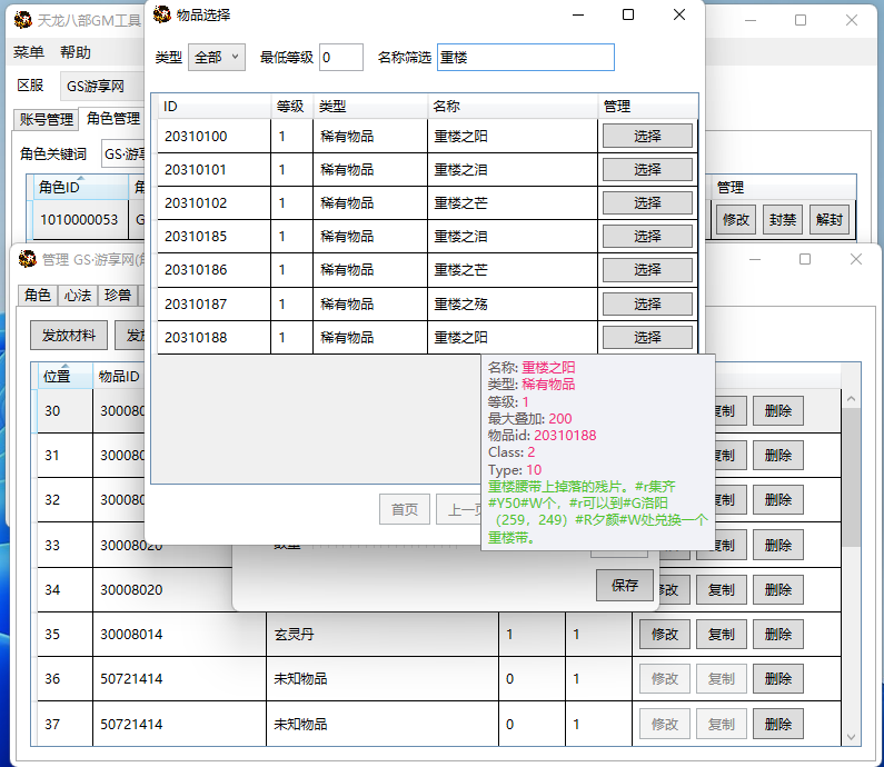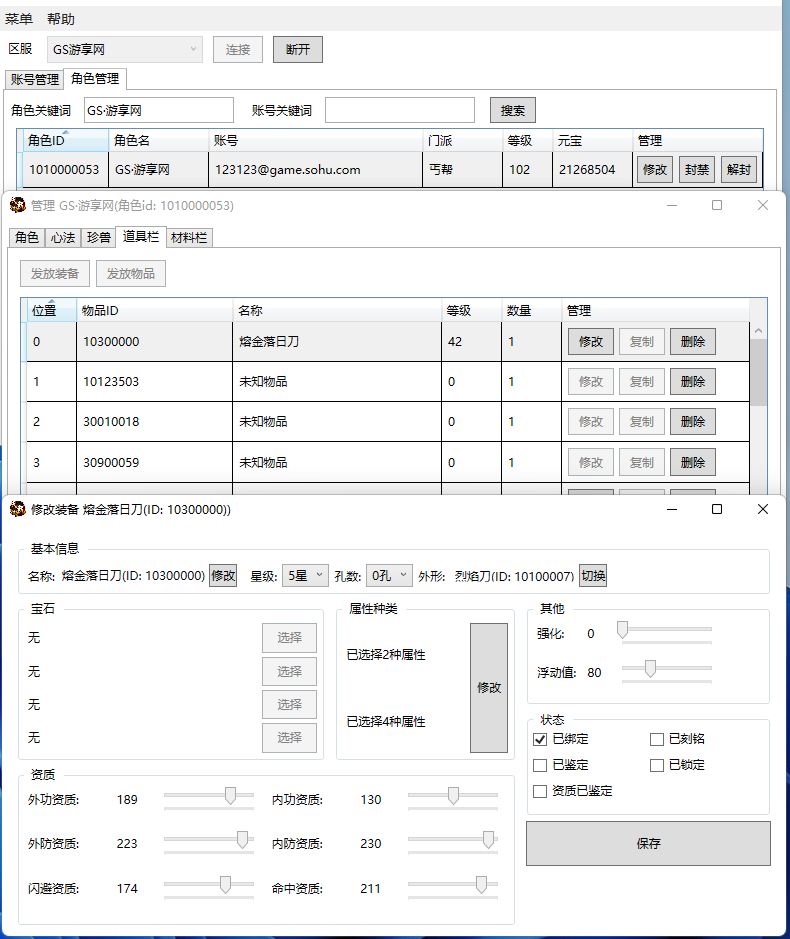 - 装备与物品管理:能发放装备和物品,查看装备的 ID、名称、等级等,修改装备的基本信息(星级、孔数、外形等)、宝石镶嵌、属性种类(血上限、外功攻击、命中、会心等)、资质(外功、内功、外防等)以及强化、浮动值等,还可选择不同类型的装备;对于物品,可发放材料、宝石等,选择不同等级和类型的物品,如 8 级宝石、稀有物品 “重楼” 系列等。