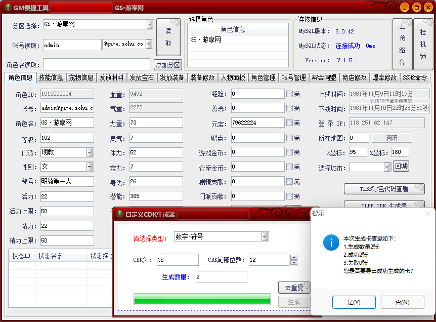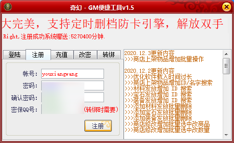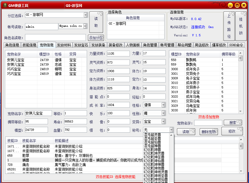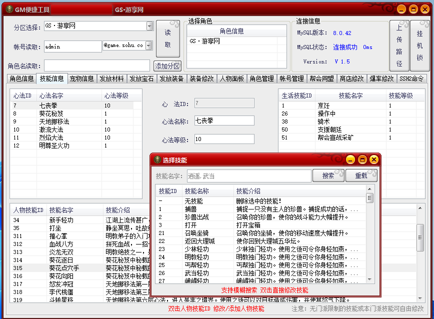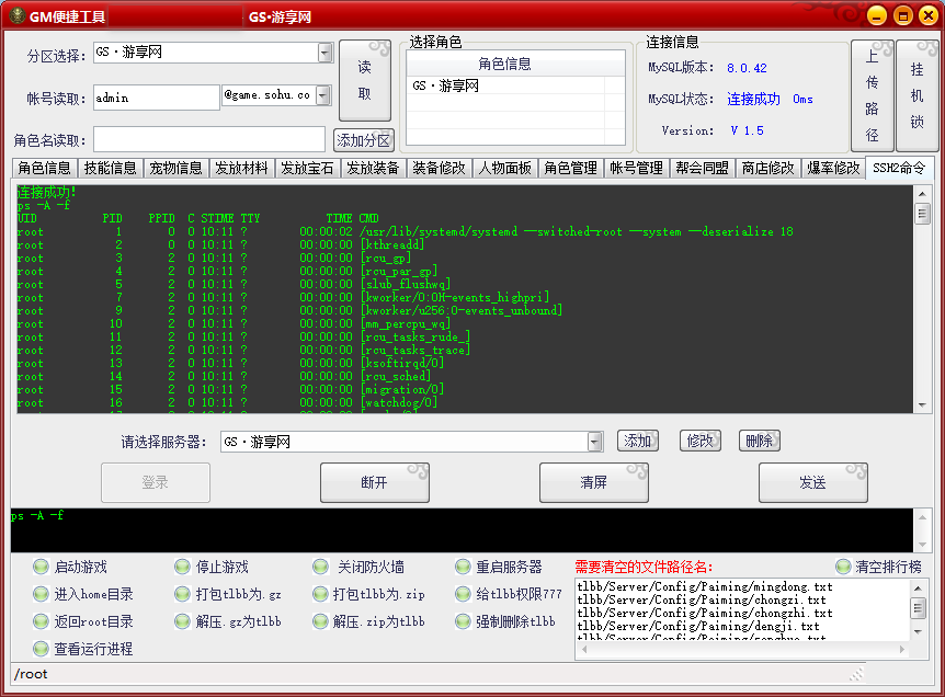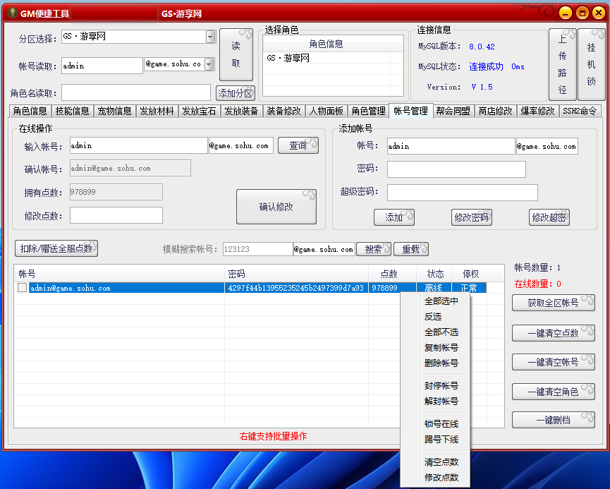 • 账号相关操作:可进行账号的登录、注册、充值、改密、转移等,还能管理角色信息,像角色 ID、账号、角色名、等级、门派等。