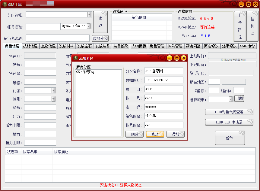 • 分区管理:能添加、修改、删除游戏分区,设置分区名称、数据库 IP、端口等连接信息。