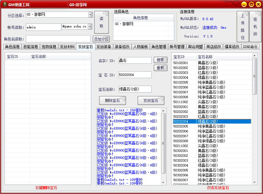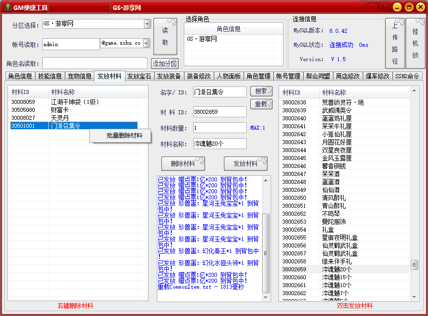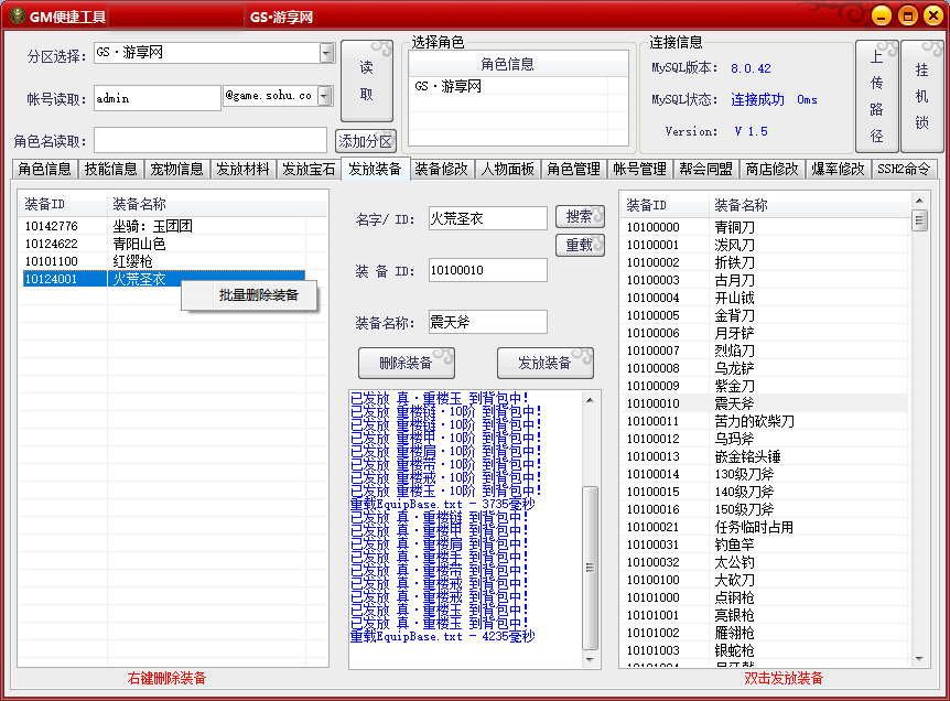 • 物品发放:可以发放材料、宝石、装备等游戏物品,支持批量操作,也能删除相关物品。