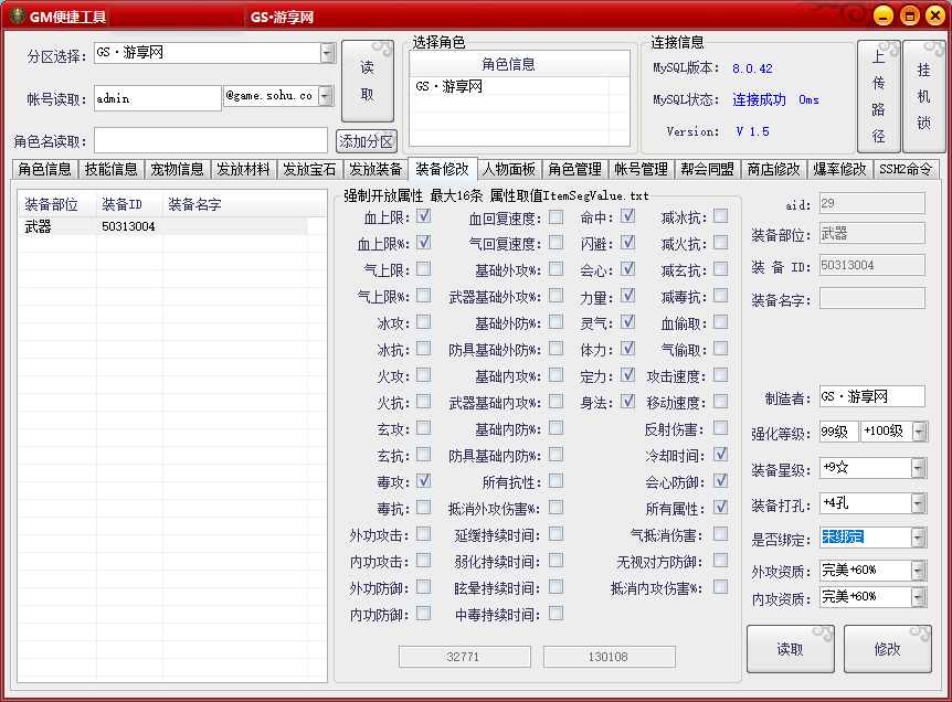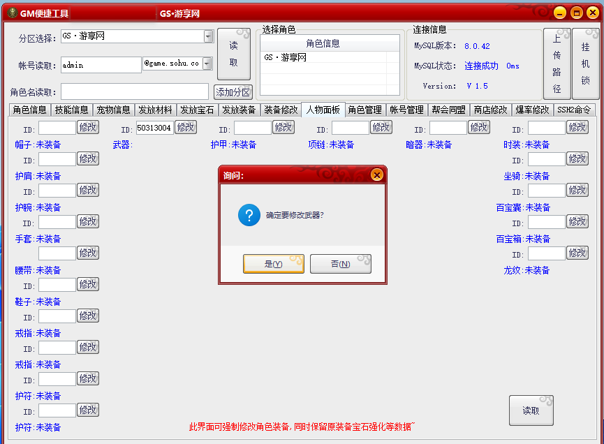 • 装备相关:可对装备进行修改,包括装备部位、属性(如血上限、气上限、各种攻击防御属性等),还能在人物面板中管理角色各部位装备,修改时会有确认提示。