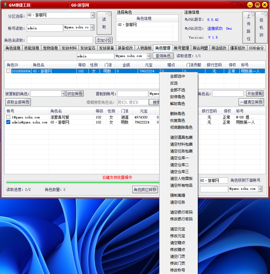 • 角色管理:能查询、复制、删除角色,还可进行角色跨区转移等操作,支持批量处理角色相关事项,比如清空角色道具包裹、材料包裹等。