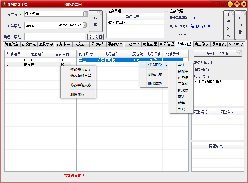 • 帮会同盟:能够管理游戏中的帮派,如修改帮派名字、宗旨、容纳人数,删除帮派,以及对帮派成员进行任命职位、加减贡献、踢出成员等操作。
