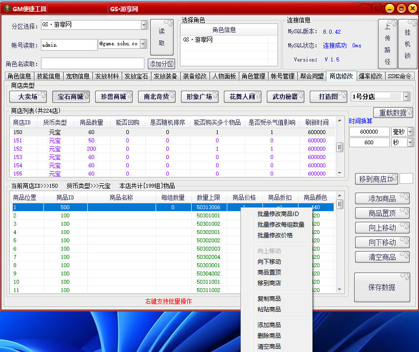 • 商店修改:可以管理游戏内的商店,如大卖场、宝石商城等,修改商店商品的 ID、每组数量、价格等,支持批量操作商品相关设置。