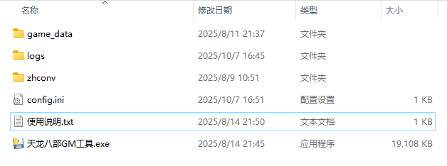 包含 game_data(游戏数据存储)、logs(日志记录)、zhconv(字符转换相关)等文件夹,以及 config.ini(配置文件)、使用说明.txt(操作指引)、天龙八部GM工具.exe(主程序,大小 19,108 KB),为工具运行提供文件基础。
