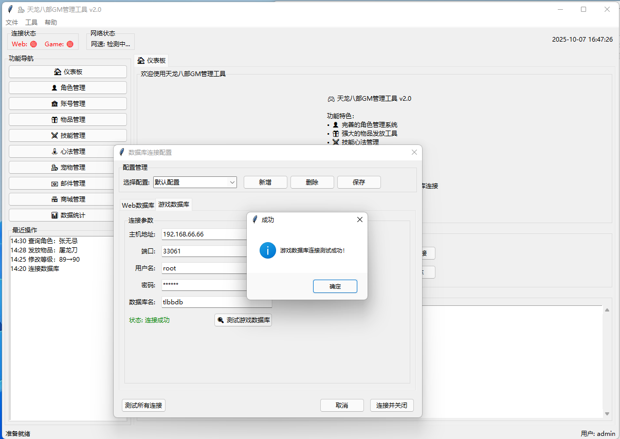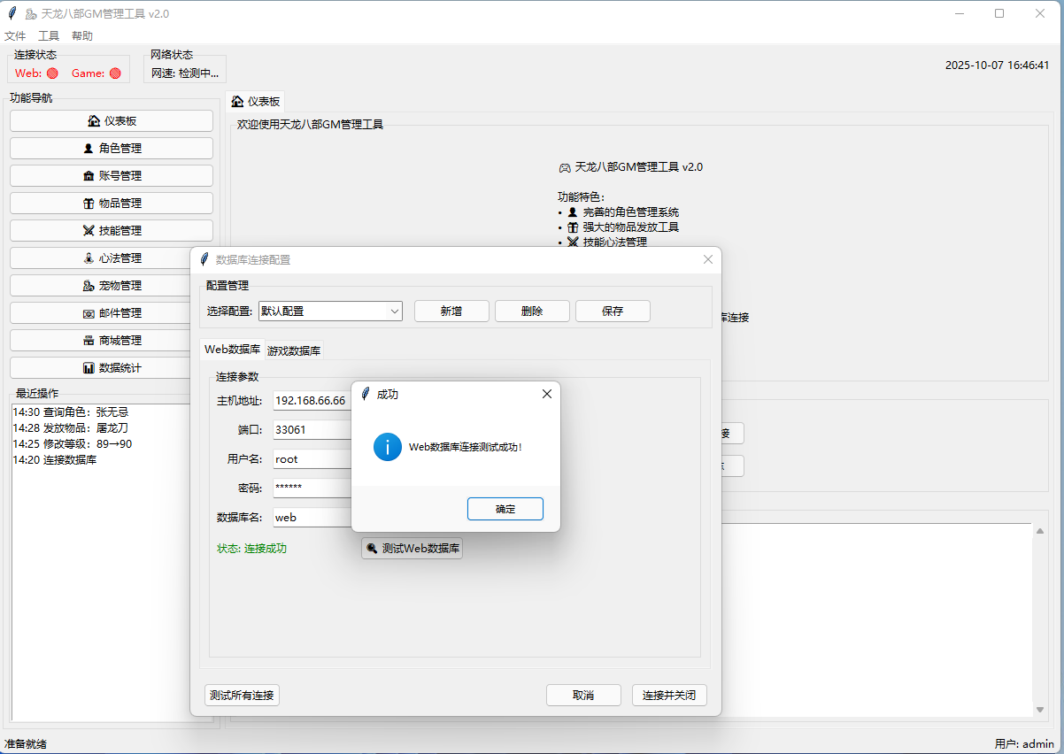 测试连接:点击 “测试 Web 数据库”“测试游戏数据库”,提示 “连接测试成功”,为后续操作建立数据通道。