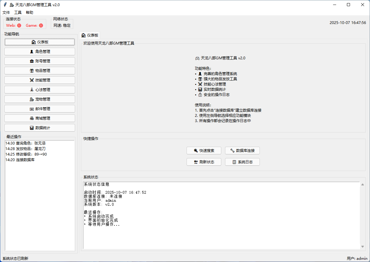 仪表板展示工具功能特色(完善的角色管理、物品发放工具等)与使用说明,还可查看 “最近操作”(如查询角色、发放物品)和 “系统状态”。