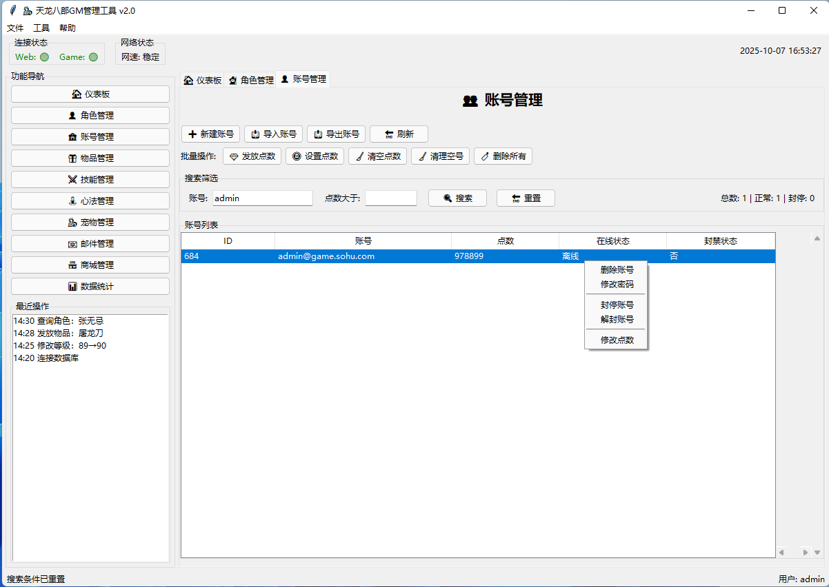 单账号操作:对账号(如 admin@game.sohu.com)可执行 “删除账号、修改密码、封停 / 解封账号、修改点数” 等,管理账号状态与资源。 - 2、物品管理