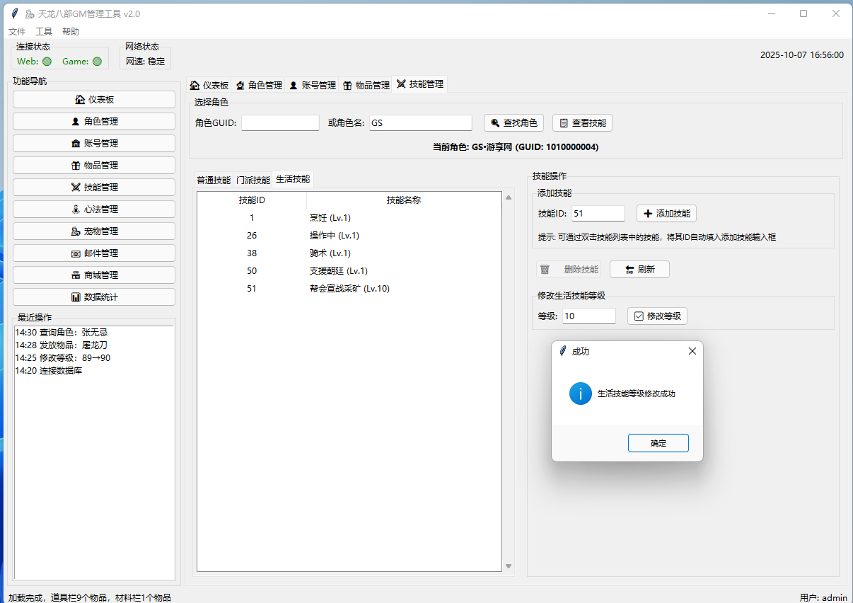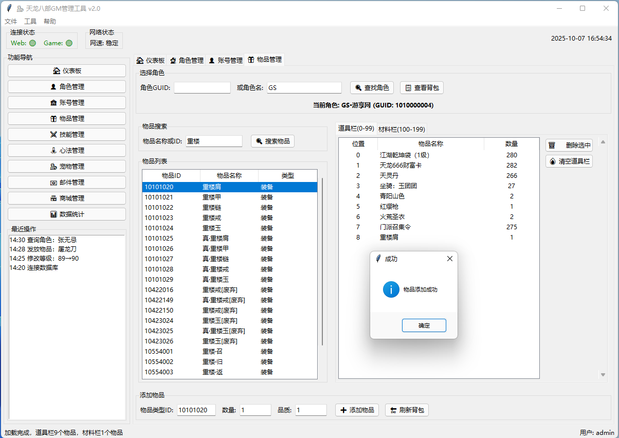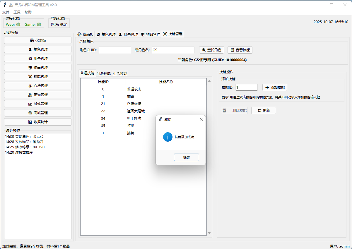 物品发放:选择角色(如 GS·游享网),输入 “物品类型 ID、数量、品质”,点击 “添加物品” 可将道具(如 “重楼肩”)发放到角色背包,提示 “物品添加成功”。 - 3、技能管理