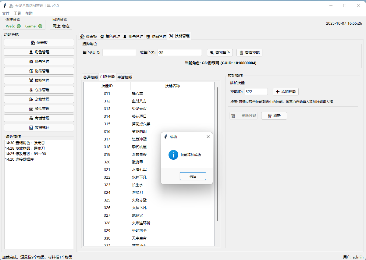 技能添加:输入 “技能 ID”(如普通技能 “捕兽” ID=1、门派技能 “水神下凡” ID=322),点击 “添加技能”,提示 “技能添加成功”。
