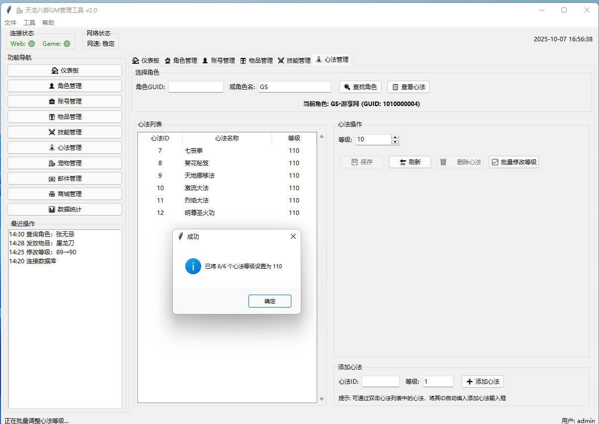 心法批量修改:选择角色的心法列表(如 “七丧拳、葵花秘笈” 等),设置目标等级(如 110 级),点击 “批量修改等级”,可一次性将多个心法等级调整为指定值,提示 “已将 6/6 个心法等级设置为 110”。